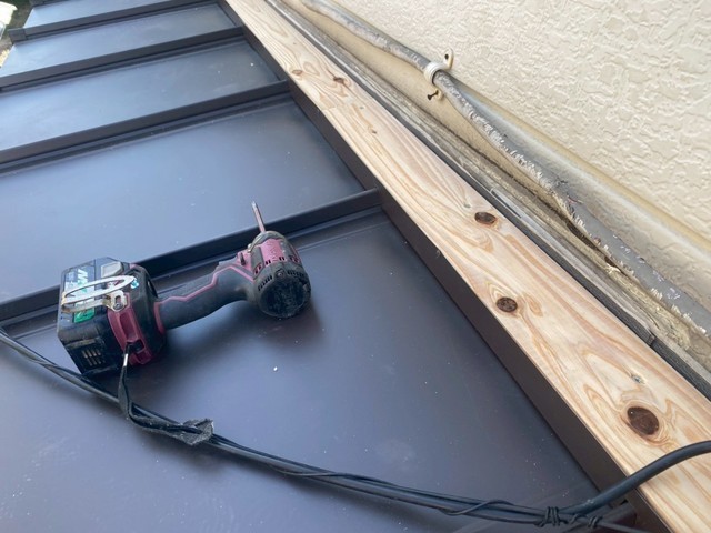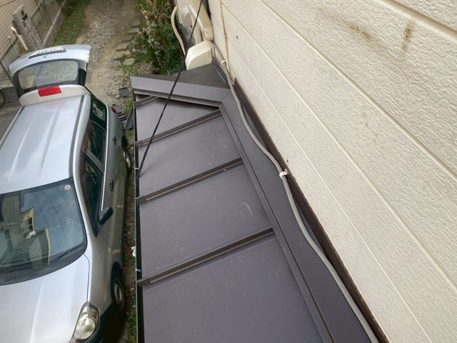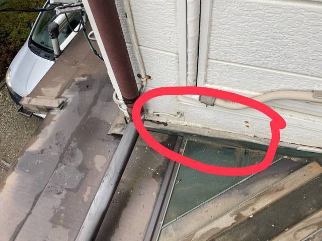 雨が横に流れて、段差の板金から雨漏りしています。